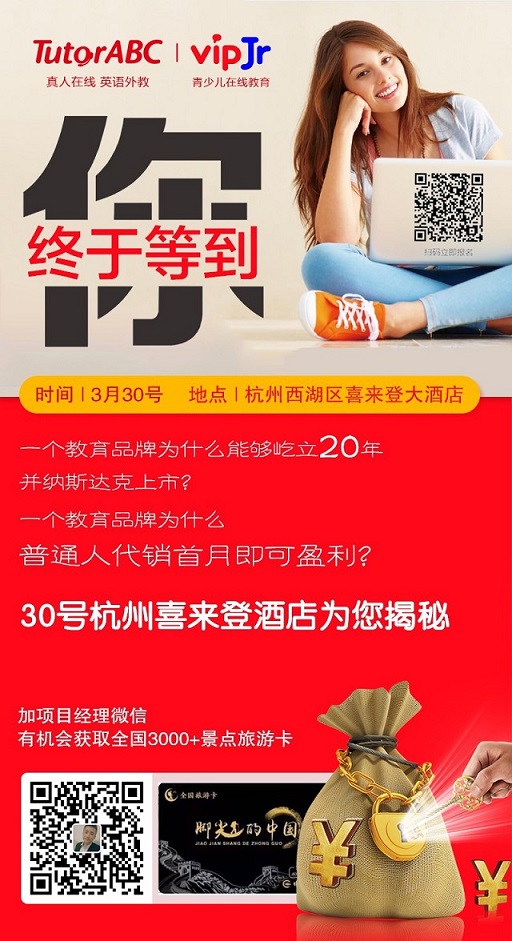 iTutorGroup在線教育集團于2001年創(chuàng)立,是全球最大的教育集團,布局全世界80多個國家,擁有5000多位員工、超過20000名外籍顧問,每年提供3000萬堂在線課程。ITutorGroup在全國各大城市召開代銷會,主推vipJr在線青少兒教育以及TutorABC成人在線英語。iTutorGroup在線教育集團中國公司找到贏想力合作,為每次的代銷會議邀約高質(zhì)量的潛在投資者到場。