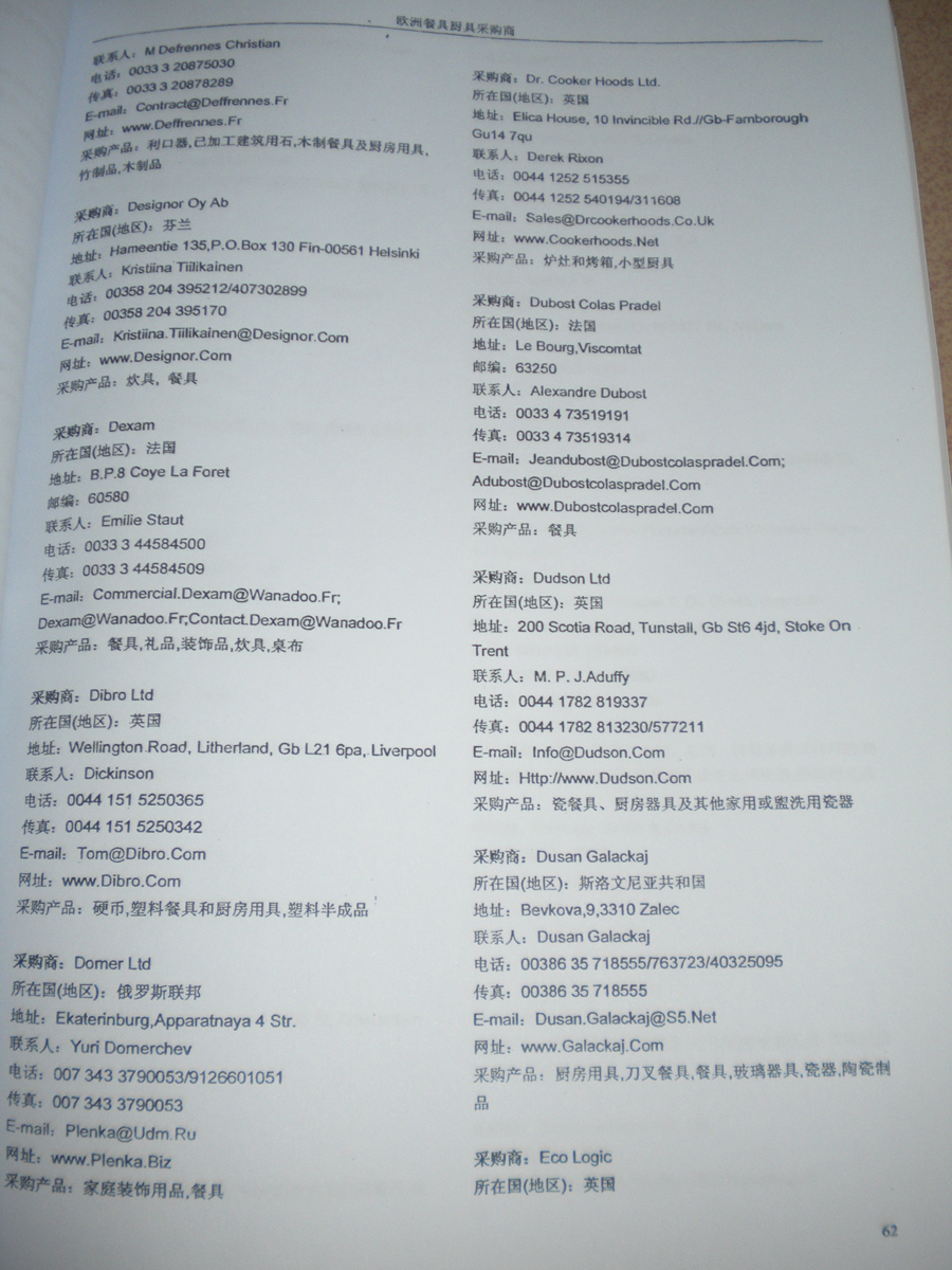 書刊簡介:《全球采商黃頁》系列叢書是由全球最活躍的專業(yè)買家及重要國際性展會的到會采購商名片信息匯編而成,包含三十多個行業(yè)分類,匯集了各類產(chǎn)品的買家信息。其中收錄的每家采購商信息均是我們通過與買家面對面的登記整理收集而成,采購意向明確,針對性強。為了確保信息的準確性和時效性,我們定期進行跟進、回訪、補充及更新工作。每家采購商信息包括國別、公司名稱、聯(lián)系人、地址、電話、傳真、電郵、網(wǎng)址、采購產(chǎn)品等詳細內(nèi)容,每冊《黃頁》約有兩千家左右的采購商信息。在當前國際出口形勢日趨嚴峻的環(huán)境下,如何降低成本開拓國際市場,是每個出口企業(yè)急需尋找的答案,我們相信通過我們10多年的外貿(mào)信息服務經(jīng)驗和最新的國際買家資源服務,將會為您拓展全球市場提供最直接有效的幫助。專業(yè)對口的買家信息一定會幫助貴公司打開更廣闊的外貿(mào)市場!
