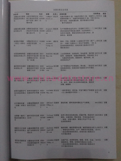 最新臺灣在大陸企業(yè)黃頁主要收錄了臺灣在大陸的獨(dú)資、合資、合作經(jīng)營等類型的企業(yè)通信黃頁,臺灣投資企業(yè)黃頁內(nèi)容有:企業(yè)名稱、地址、電話、傳真、電子郵箱、經(jīng)營范圍、注冊資金等;臺資企業(yè)黃頁都是一些國際上的知名品牌企業(yè)在大陸地區(qū)設(shè)立的分公司及辦事機(jī)構(gòu),這類企業(yè)經(jīng)濟(jì)實(shí)力、技術(shù)實(shí)力與品牌效應(yīng)都比較強(qiáng),與這類企業(yè)開展合作業(yè)務(wù)是許多國內(nèi)企業(yè)夢寐以求的事情,因此在大陸臺資企業(yè)名單是各個國內(nèi)企業(yè)提高銷售業(yè)績必備的參考工具!