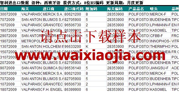 智利進(jìn)口關(guān)單數(shù)據(jù),以智利本土企業(yè)向全球 200 多個國家和地區(qū)進(jìn)口各類商品的進(jìn)口申報單證為依據(jù)。按照具體產(chǎn)品的精確 HS 編碼提供。內(nèi)容包括:進(jìn)口日期、進(jìn)口海關(guān)、進(jìn)口商名稱、 進(jìn)口商代碼、附加碼、海關(guān)編碼、產(chǎn)品品名、嘜頭、品種、原產(chǎn)國、中轉(zhuǎn)國、付款方式、交易條款、運輸方式、海運公司、起運港、目的港、貨物類型、重量、重量單位等