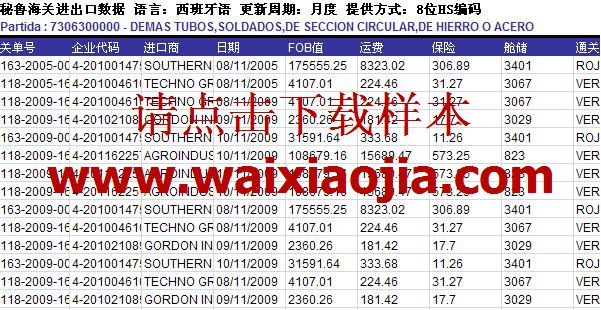秘魯進(jìn)口關(guān)單數(shù)據(jù),以秘魯本土企業(yè)向全球 200 多個(gè)國(guó)家和地區(qū)進(jìn)口各類商品的進(jìn)口申報(bào)單證為依據(jù)。按照具體產(chǎn)品的精確 HS 編碼提供。數(shù)據(jù)內(nèi)容包括: 海關(guān)單號(hào)、企業(yè)代碼、進(jìn)口商、日期、 FOB 值、 運(yùn)費(fèi)、保險(xiǎn)、艙儲(chǔ)、通關(guān)類型、凈重、件數(shù) 、序號(hào)、海關(guān)編碼、產(chǎn)品描述、數(shù)量、單位、采購(gòu)國(guó)、原產(chǎn)國(guó)、凈重、 FOB 價(jià)、 運(yùn)費(fèi)、保險(xiǎn)、證書、從價(jià)、銷售稅等項(xiàng)次內(nèi)容。