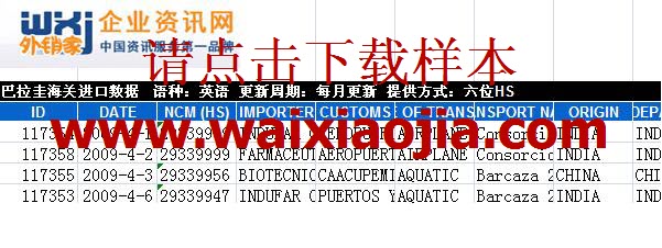 巴拉圭進口關單數據,以 巴拉圭 本土企業(yè)向全球 200 多個國家和地區(qū)進口各類商品的進口申報單證為依據。按照具體產品的精確 HS 編碼提供。數據內容包括:產品詳細描述、海關編碼描述、關單號、 日期、海關編碼、 進口商、進口商地址、電話、海關、運輸方式、運輸公司、原產國、采購國、數量、數量單位、 FOB 美元總價、 FOB 美元單價、 CIF 美元總價、 CIF 美元單價運費、千克凈重、毛重、出口商、運輸標志等詳細情報信息。