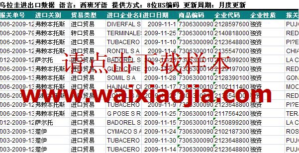 烏拉圭進(jìn)口關(guān)單數(shù)據(jù),以 巴拉圭 本土企業(yè)向全球 200 多個(gè)國家和地區(qū)進(jìn)口各類商品的進(jìn)口申報(bào)單證為依據(jù)。按照具體產(chǎn)品的精確 HS 編碼提供。數(shù)據(jù)內(nèi)容包括:貿(mào)易類型、 關(guān)單號(hào)、通關(guān)日期、進(jìn)口商代碼、進(jìn)口商名稱、進(jìn)口商地址、電話、原產(chǎn)國、貿(mào)易國、通關(guān)口岸、 FOB 總價(jià)、 CIF 總價(jià)、數(shù)量、數(shù)量單位、 CIF 單價(jià)、千克凈重、千克毛重、保險(xiǎn)費(fèi)、運(yùn)輸費(fèi)、運(yùn)輸方式、運(yùn)輸公司、出口商、海關(guān)編碼、產(chǎn)品描述