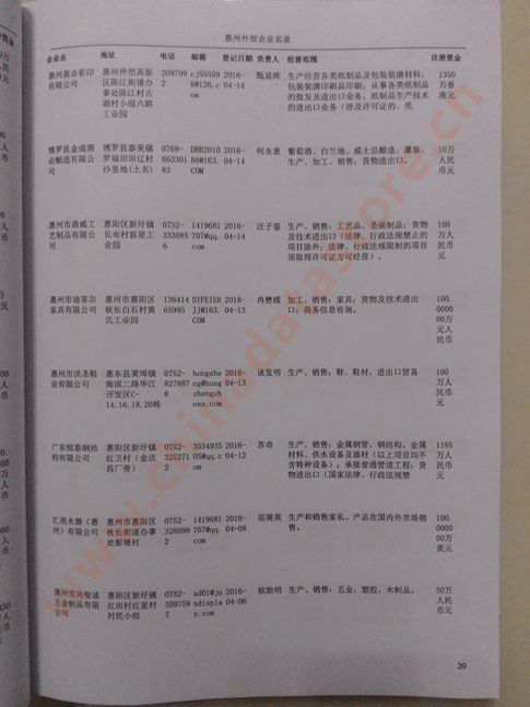 2021版最新惠州企業(yè)黃頁包括《惠州制造企業(yè)黃頁》、《惠州貿(mào)易企業(yè)黃頁》、《惠州民營企業(yè)黃頁》、《惠州外資企業(yè)黃頁》、《惠州外貿(mào)企業(yè)黃頁》共五冊,現(xiàn)優(yōu)惠價(jià):280元/冊。每冊內(nèi)容包括:單位名稱、地址、郵編、電話、傳真、郵箱、經(jīng)營范圍等;惠州企業(yè)黃頁涵蓋了近幾年來最新成立的、有一定規(guī)模的企業(yè),具有非常高的營銷價(jià)值。有了這套黃頁開展業(yè)務(wù)也有了針對性,也省去了盲目去尋找客戶名單而浪費(fèi)的時間了,工作效率也會有很大的提高。歡迎需要惠州企業(yè)黃頁的朋友及時聯(lián)系我們!