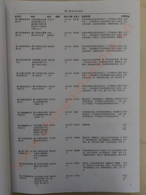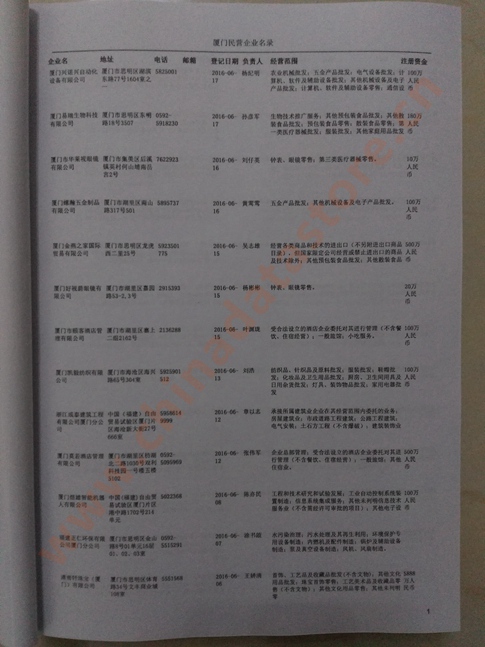 2021版最新廈門企業(yè)黃頁(yè)包括《廈門制造企業(yè)黃頁(yè)》、《廈門貿(mào)易企業(yè)黃頁(yè)》、《廈門民營(yíng)企業(yè)黃頁(yè)》、《廈門外資企業(yè)黃頁(yè)》、《廈門外貿(mào)企業(yè)黃頁(yè)》共五冊(cè),現(xiàn)優(yōu)惠價(jià):280元/冊(cè)。每?jī)?cè)內(nèi)容包括:?jiǎn)挝幻Q、地址、郵編、電話、傳真、郵箱、經(jīng)營(yíng)范圍等;廈門企業(yè)黃頁(yè)涵蓋了近幾年來(lái)最新成立的、有一定規(guī)模的企業(yè),具有非常高的營(yíng)銷價(jià)值。有了這套黃頁(yè)開(kāi)展業(yè)務(wù)也有了針對(duì)性,也省去了盲目去尋找客戶名單而浪費(fèi)的時(shí)間了,工作效率也會(huì)有很大的提高。歡迎需要廈門企業(yè)黃頁(yè)的朋友及時(shí)聯(lián)系我們!