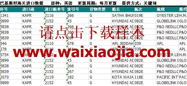 巴基斯坦海關(guān)進(jìn)口數(shù)據(jù)(PKCD of Imports)共28個(gè)字段,含:產(chǎn)品描述、數(shù)量、國外出口商、巴基斯坦進(jìn)口商、巴基斯坦進(jìn)口商地址、提單日期、目的港、單位、進(jìn)口國、序號(hào)、艙單日期、起運(yùn)港、運(yùn)輸方式、艙單號(hào)、船名、航線、船代、提單號(hào)等。