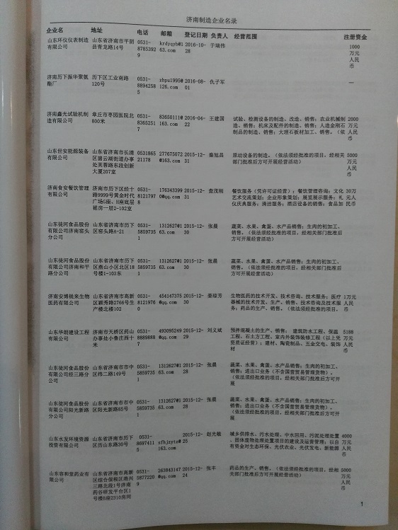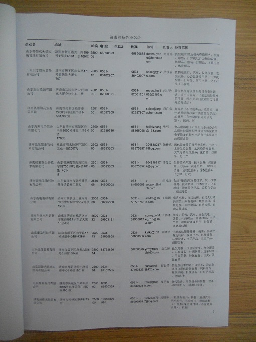 2021版最新濟(jì)南企業(yè)黃頁包括《濟(jì)南制造企業(yè)黃頁》、《濟(jì)南貿(mào)易企業(yè)黃頁》、《濟(jì)南民營(yíng)企業(yè)黃頁》、《濟(jì)南外資企業(yè)黃頁》、《濟(jì)南外貿(mào)企業(yè)黃頁》共五冊(cè),現(xiàn)優(yōu)惠價(jià):280元/冊(cè)。每?jī)?cè)內(nèi)容包括:?jiǎn)挝幻Q、地址、郵編、電話、傳真、郵箱、經(jīng)營(yíng)范圍等;濟(jì)南企業(yè)黃頁涵蓋了近幾年來最新成立的、有一定規(guī)模的企業(yè),具有非常高的營(yíng)銷價(jià)值。有了這套黃頁開展業(yè)務(wù)也有了針對(duì)性,也省去了盲目去尋找客戶名單而浪費(fèi)的時(shí)間了,工作效率也會(huì)有很大的提高。歡迎需要濟(jì)南企業(yè)黃頁的朋友及時(shí)聯(lián)系我們!