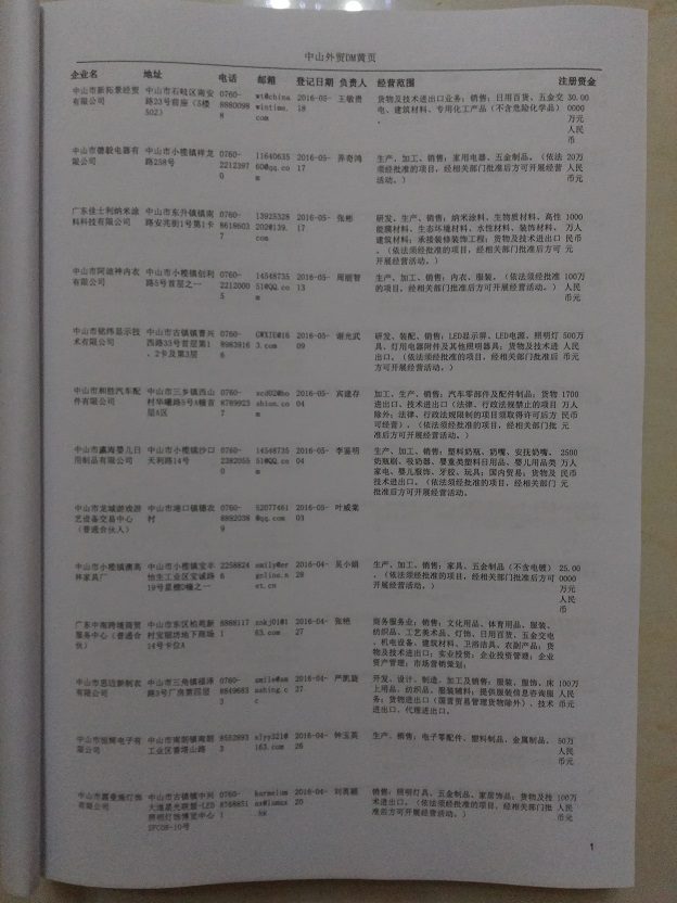 2021版最新中山企業(yè)黃頁包括《中山制造企業(yè)黃頁》、《中山貿(mào)易企業(yè)黃頁》、《中山民營企業(yè)黃頁》、《中山外資企業(yè)黃頁》、《中山外貿(mào)企業(yè)黃頁》共五冊,現(xiàn)優(yōu)惠價:280元/冊。每冊內(nèi)容包括:單位名稱、地址、郵編、電話、傳真、郵箱、經(jīng)營范圍等;中山企業(yè)黃頁涵蓋了近幾年來最新成立的、有一定規(guī)模的企業(yè),具有非常高的營銷價值。有了這套黃頁開展業(yè)務(wù)也有了針對性,也省去了盲目去尋找客戶名單而浪費的時間了,工作效率也會有很大的提高。歡迎需要中山企業(yè)黃頁的朋友及時聯(lián)系我們!