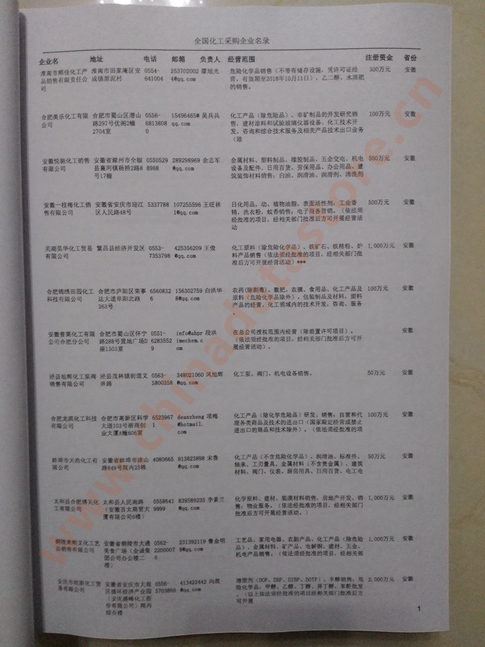 2024年新版中國化工采購企業(yè)黃頁,收錄了全國各地經(jīng)營范圍涉及化工產(chǎn)品的貿(mào)易企業(yè),這些都是頗具實力的化工產(chǎn)品的中國采購商。黃頁內(nèi)容包含:企業(yè)名稱、地址、電話、傳真、郵箱、經(jīng)營范圍、省份、注冊資金等信息。該套黃頁包含一個黃頁光碟加一冊紙質(zhì)書刊,全國價格:1500元,省/直轄市價格:400元,城市價格:200元,共收錄了全國各地大概77995(統(tǒng)計日期:2018.1)家化工產(chǎn)品采購企業(yè)。黃頁光碟中是EXCEL格式,信息可任意修改、復制、打印、導出及導入到傳真、郵件群發(fā)等軟件中,無任何限制。