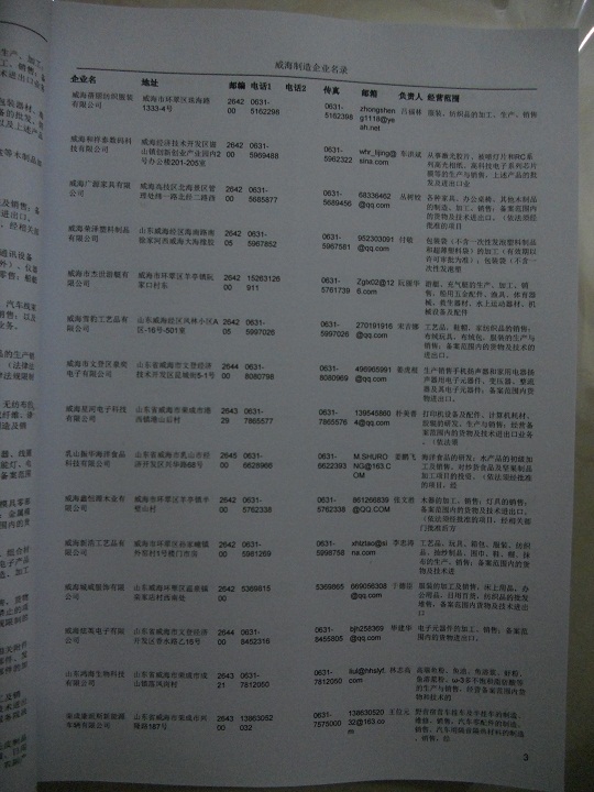 2021版最新威海企業(yè)黃頁(yè)包括《威海制造企業(yè)黃頁(yè)》、《威海民營(yíng)企業(yè)黃頁(yè)》,現(xiàn)優(yōu)惠價(jià):280元/冊(cè)。每?jī)?cè)內(nèi)容包括:?jiǎn)挝幻Q(chēng)、地址、郵編、電話、傳真、郵箱、經(jīng)營(yíng)范圍等;威海企業(yè)黃頁(yè)涵蓋了近幾年來(lái)最新成立的、有一定規(guī)模的企業(yè),具有非常高的營(yíng)銷(xiāo)價(jià)值。有了這套黃頁(yè)開(kāi)展業(yè)務(wù)也有了針對(duì)性,也省去了盲目去尋找客戶名單而浪費(fèi)的時(shí)間了,工作效率也會(huì)有很大的提高。歡迎需要威海企業(yè)黃頁(yè)的朋友及時(shí)聯(lián)系我們!