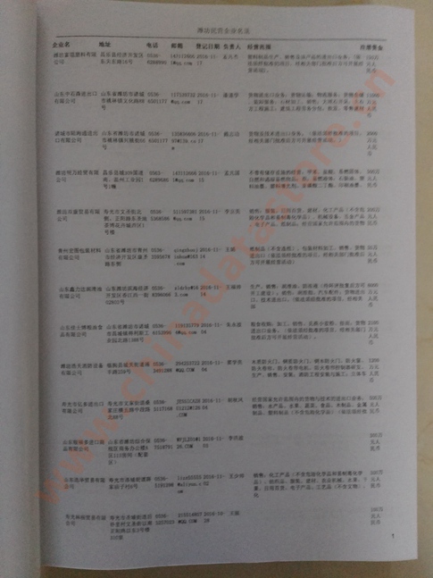 2021版最新濰坊企業(yè)黃頁包括《濰坊制造企業(yè)黃頁》、《濰坊民營企業(yè)黃頁》,現(xiàn)優(yōu)惠價:280元/冊。每冊內(nèi)容包括:單位名稱、地址、郵編、電話、傳真、郵箱、經(jīng)營范圍等;濰坊企業(yè)黃頁涵蓋了近幾年來最新成立的、有一定規(guī)模的企業(yè),具有非常高的營銷價值。有了這套黃頁開展業(yè)務也有了針對性,也省去了盲目去尋找客戶名單而浪費的時間了,工作效率也會有很大的提高。歡迎需要濰坊企業(yè)黃頁的朋友及時聯(lián)系我們!