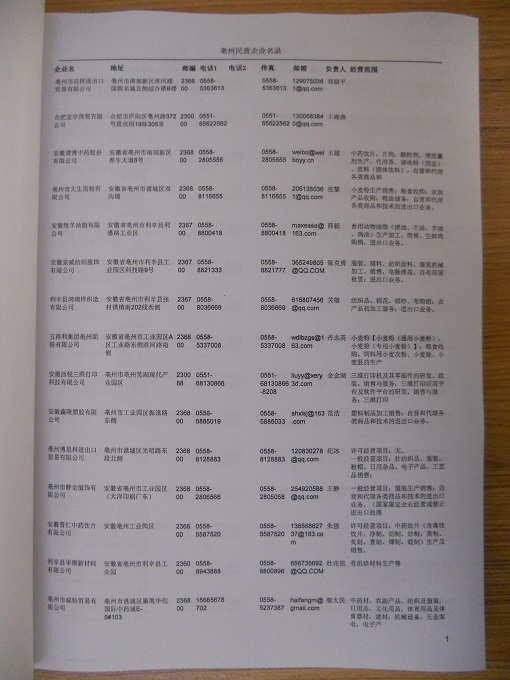 2021版最新亳州企業(yè)黃頁包括《亳州制造企業(yè)黃頁》、《亳州民營企業(yè)黃頁》,現(xiàn)優(yōu)惠價(jià):280元/冊(cè)。每冊(cè)內(nèi)容包括:單位名稱、地址、郵編、電話、傳真、郵箱、經(jīng)營范圍等;亳州企業(yè)黃頁涵蓋了近幾年來最新成立的、有一定規(guī)模的企業(yè),具有非常高的營銷價(jià)值。有了這套黃頁開展業(yè)務(wù)也有了針對(duì)性,也省去了盲目去尋找客戶名單而浪費(fèi)的時(shí)間了,工作效率也會(huì)有很大的提高。歡迎需要亳州企業(yè)黃頁的朋友及時(shí)聯(lián)系我們!