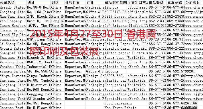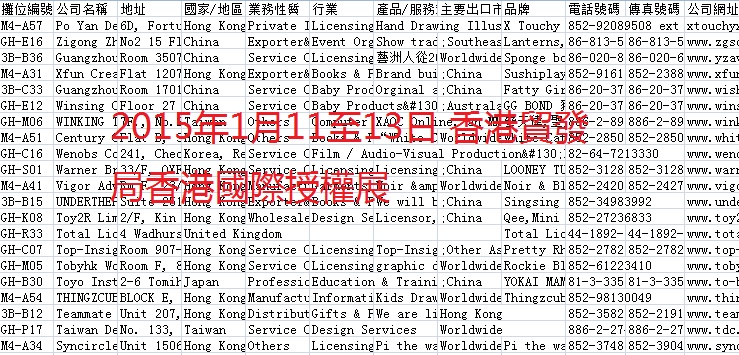 簡(jiǎn)介:2015年香港貿(mào)發(fā)局展會(huì)會(huì)刊共收錄28個(gè)展會(huì)參展商信息。數(shù)據(jù)格式EXCEL,會(huì)刊內(nèi)容包含:公司名稱、地址、地區(qū)、業(yè)務(wù)性質(zhì)、行業(yè)、產(chǎn)品服務(wù)范圍、出口市場(chǎng)、電話、傳真、網(wǎng)址。
