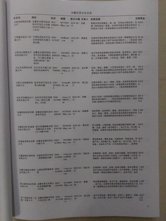 2021版最新安徽企業(yè)黃頁包括《安徽制造企業(yè)黃頁》、《安徽貿(mào)易企業(yè)黃頁》、《安徽民營企業(yè)黃頁》共三冊,優(yōu)惠價:280元/冊。每冊內(nèi)容包括:單位名稱、地址、郵編、電話、傳真、郵箱、經(jīng)營范圍等;安徽企業(yè)黃頁涵蓋了近幾年來最新成立的、有一定規(guī)模的企業(yè),具有非常高的營銷價值。有了這套黃頁開展業(yè)務(wù)也有了針對性,也省去了盲目去尋找客戶名單而浪費的時間了,工作效率也會有很大的提高。歡迎需要安徽企業(yè)黃頁的朋友及時聯(lián)系我們!