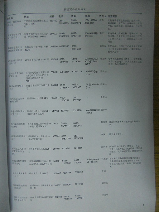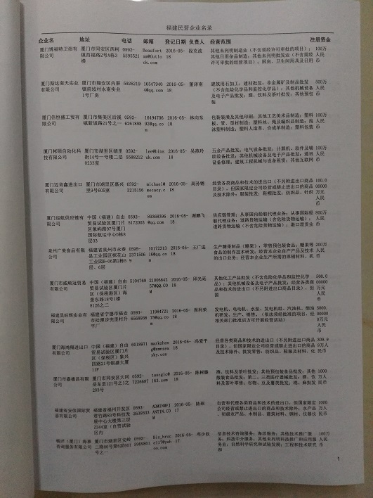 2021版最新福建企業(yè)黃頁包括《福建制造企業(yè)黃頁》、《福建貿(mào)易企業(yè)黃頁》、《福建民營企業(yè)黃頁》共三冊,優(yōu)惠價(jià):280元/冊。每冊內(nèi)容包括:單位名稱、地址、郵編、電話、傳真、郵箱、經(jīng)營范圍等;福建企業(yè)黃頁涵蓋了近幾年來最新成立的、有一定規(guī)模的企業(yè),具有非常高的營銷價(jià)值。有了這套黃頁開展業(yè)務(wù)也有了針對性,也省去了盲目去尋找客戶名單而浪費(fèi)的時(shí)間了,工作效率也會有很大的提高。歡迎需要福建企業(yè)黃頁的朋友及時(shí)聯(lián)系我們!