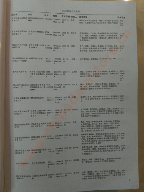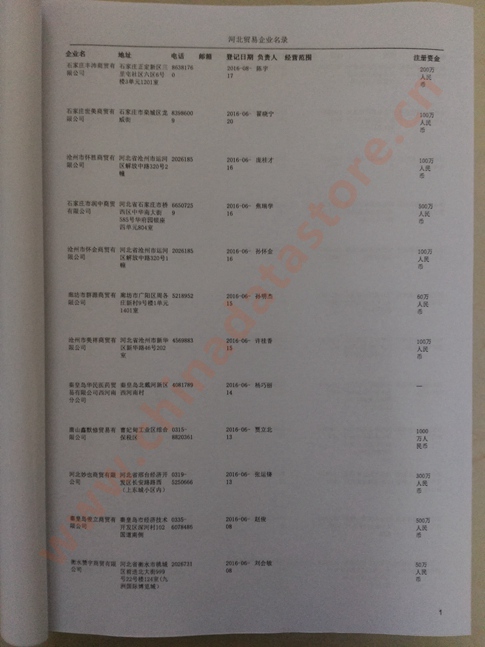 2021版最新河北企業(yè)黃頁包括《河北制造企業(yè)黃頁》、《河北貿易企業(yè)黃頁》、《河北民營企業(yè)黃頁》共三冊,優(yōu)惠價:280元/冊。每冊內容包括:單位名稱、地址、郵編、電話、傳真、郵箱、經(jīng)營范圍等;河北企業(yè)黃頁涵蓋了近幾年來最新成立的、有一定規(guī)模的企業(yè),具有非常高的營銷價值。有了這套黃頁開展業(yè)務也有了針對性,也省去了盲目去尋找客戶名單而浪費的時間了,工作效率也會有很大的提高。歡迎需要河北企業(yè)黃頁的朋友及時聯(lián)系我們!