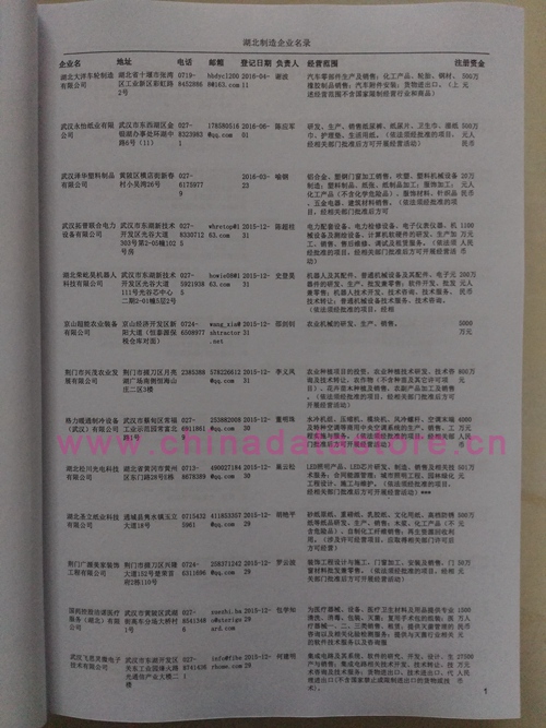 2021版最新湖北企業(yè)黃頁包括《湖北制造企業(yè)黃頁》、《湖北貿(mào)易企業(yè)黃頁》、《湖北民營企業(yè)黃頁》共三冊(cè),優(yōu)惠價(jià):280元/冊(cè)。每冊(cè)內(nèi)容包括:單位名稱、地址、郵編、電話、傳真、郵箱、經(jīng)營范圍等;湖北企業(yè)黃頁涵蓋了近幾年來最新成立的、有一定規(guī)模的企業(yè),具有非常高的營銷價(jià)值。有了這套黃頁開展業(yè)務(wù)也有了針對(duì)性,也省去了盲目去尋找客戶名單而浪費(fèi)的時(shí)間了,工作效率也會(huì)有很大的提高。歡迎需要湖北企業(yè)黃頁的朋友及時(shí)聯(lián)系我們!