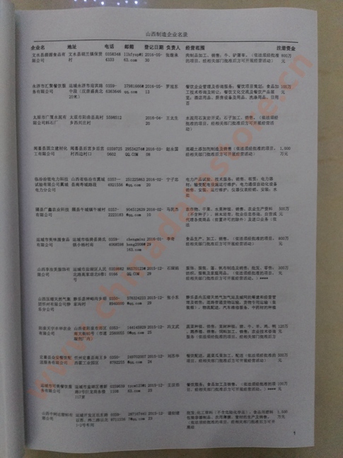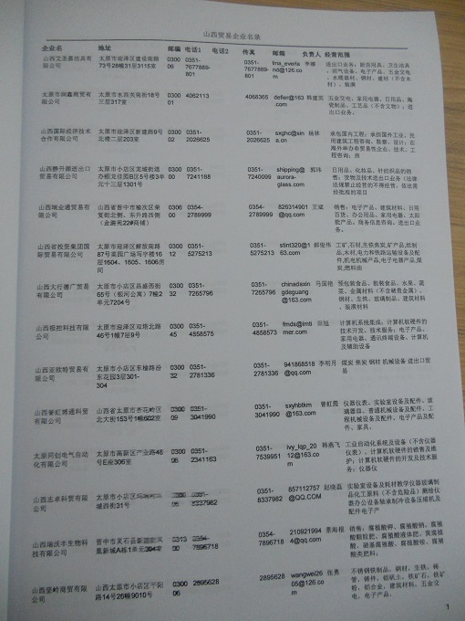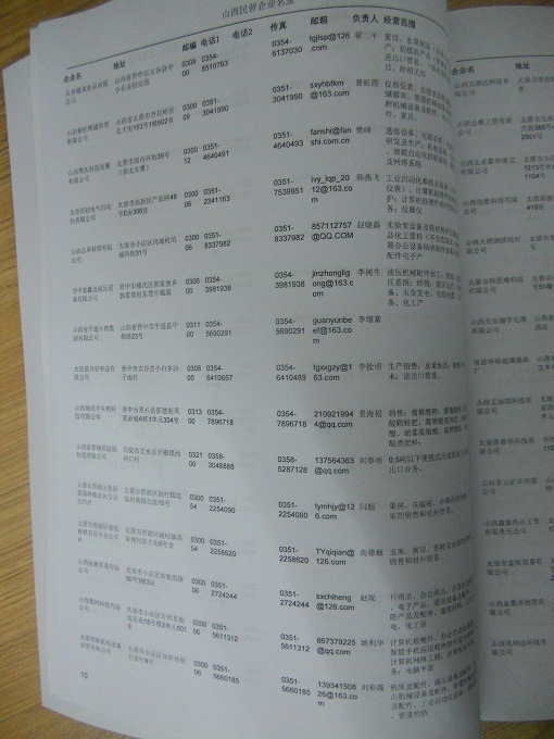 2021版最新山西企業(yè)黃頁(yè)包括《山西制造企業(yè)黃頁(yè)》、《山西貿(mào)易企業(yè)黃頁(yè)》、《山西民營(yíng)企業(yè)黃頁(yè)》共三冊(cè),優(yōu)惠價(jià):280元/冊(cè)。每?jī)?cè)內(nèi)容包括:?jiǎn)挝幻Q(chēng)、地址、郵編、電話(huà)、傳真、郵箱、經(jīng)營(yíng)范圍等;山西企業(yè)黃頁(yè)涵蓋了近幾年來(lái)最新成立的、有一定規(guī)模的企業(yè),具有非常高的營(yíng)銷(xiāo)價(jià)值。有了這套黃頁(yè)開(kāi)展業(yè)務(wù)也有了針對(duì)性,也省去了盲目去尋找客戶(hù)名單而浪費(fèi)的時(shí)間了,工作效率也會(huì)有很大的提高。歡迎需要山西企業(yè)黃頁(yè)的朋友及時(shí)聯(lián)系我們!