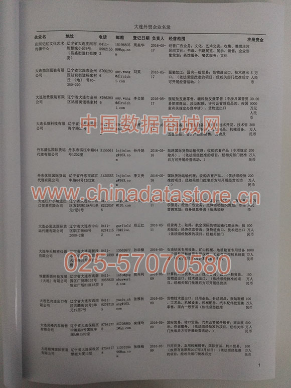 大連外貿(mào)企業(yè)黃頁包括:外貿(mào)企業(yè)名稱、地址、電話、傳真、郵箱、經(jīng)營(yíng)范圍、注冊(cè)資金等信息。