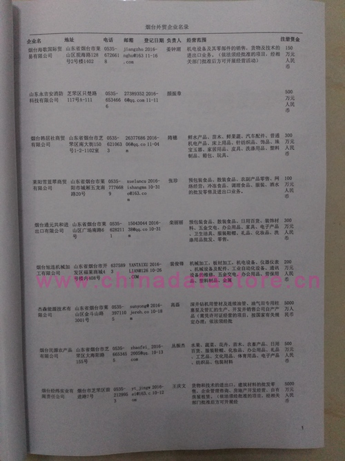 煙臺外貿企業(yè)黃頁包括:外貿企業(yè)名稱、地址、電話、傳真、郵箱、經營范圍、注冊資金等信息。