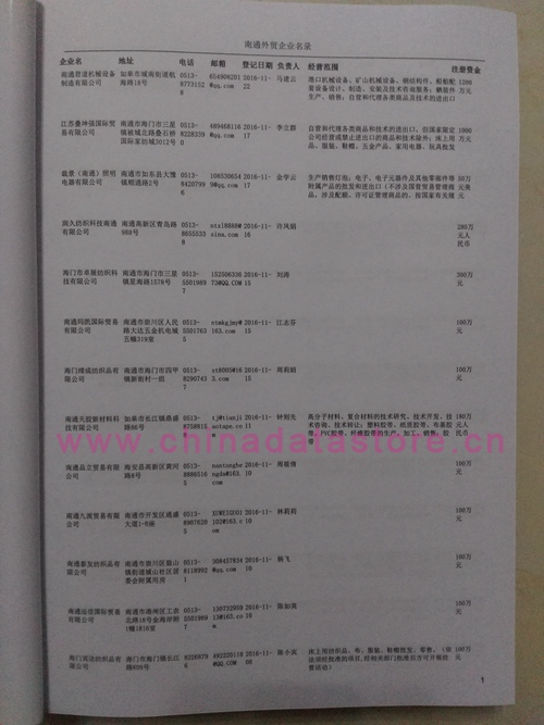 南通外貿(mào)企業(yè)黃頁包括:外貿(mào)企業(yè)名稱、地址、電話、傳真、郵箱、經(jīng)營范圍、注冊資金等信息。