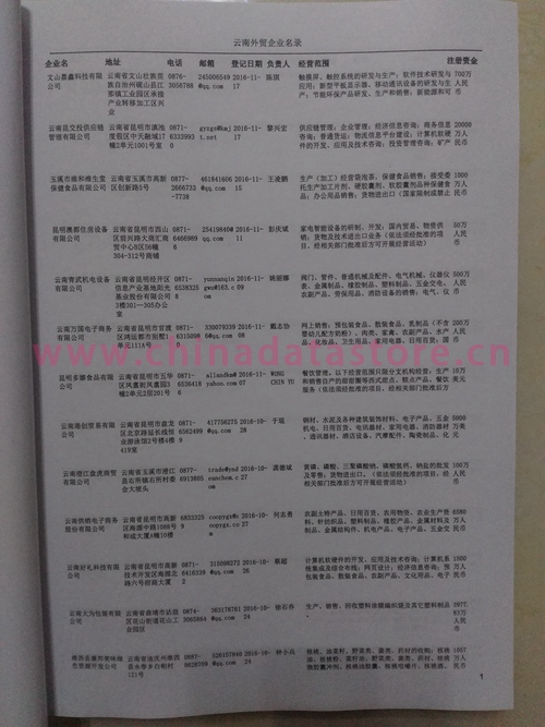 云南外貿企業(yè)黃頁包括:外貿企業(yè)名稱、地址、電話、傳真、郵箱、經營范圍、注冊資金等信息。