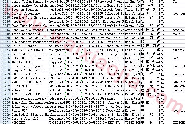 箱包皮具采購商名單數(shù)據(jù)為Excel格式,信息可任意修改、復(fù)制、打印、導(dǎo)出及導(dǎo)入到傳真、郵件群發(fā)等軟件中,無任何限制。