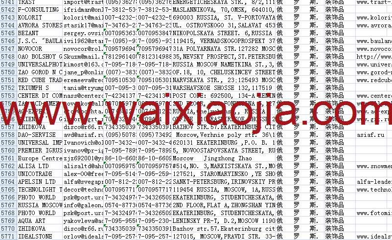 俄羅斯采購(gòu)商名單數(shù)據(jù)為Excel格式,信息可任意修改、復(fù)制、打印、導(dǎo)出及導(dǎo)入到傳真、郵件群發(fā)等軟件中,無(wú)任何限制。