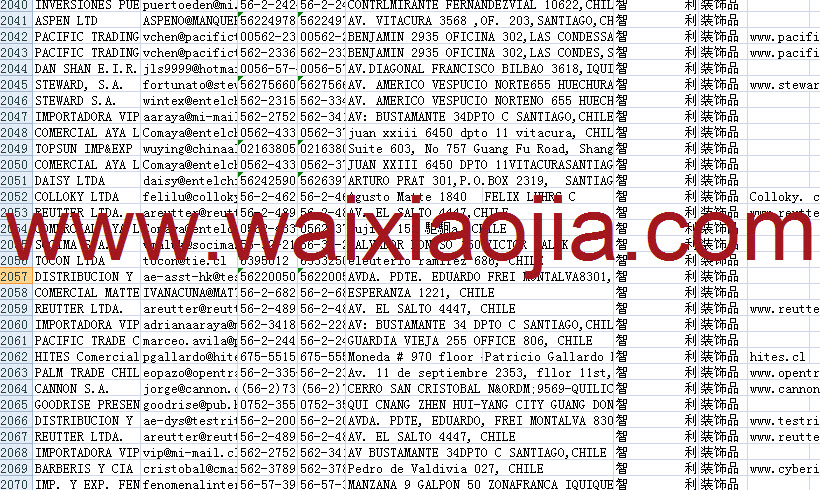 智利采購商名單數(shù)據(jù)為Excel格式,信息可任意修改、復(fù)制、打印、導(dǎo)出及導(dǎo)入到傳真、郵件群發(fā)等軟件中,無任何限制。